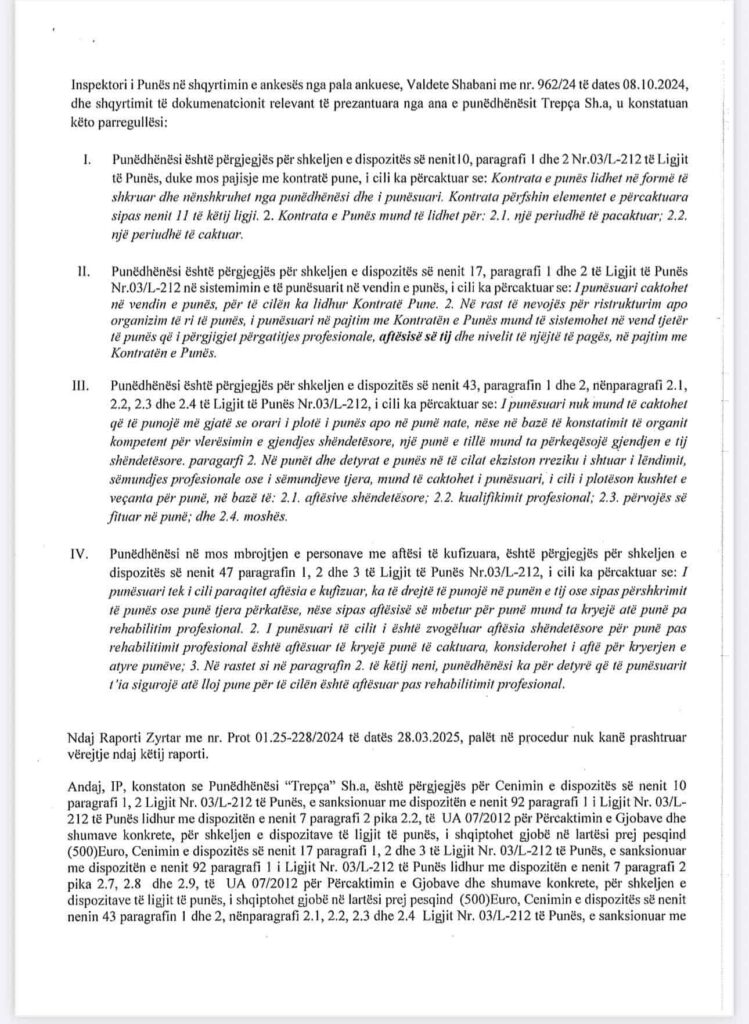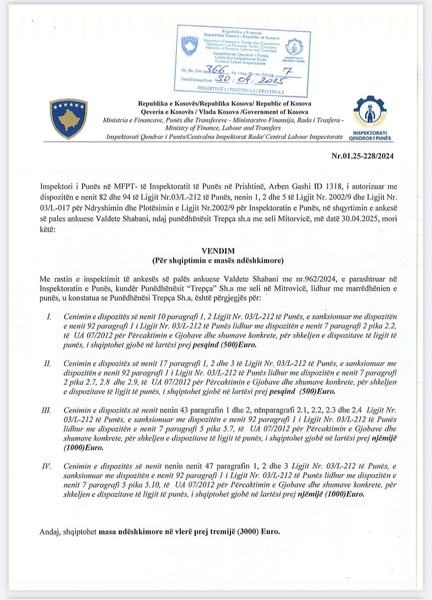 Znj. Shabani nuk pranoi të heshtë përballë kësaj padrejtësie. Ajo vendosi ta kërkojë të drejtën e saj në rrugë ligjore dhe, pas një beteje të gjatë me institucionet e drejtësisë, arriti të fitojë jo një herë, por dy herë rresht në Inspektoratin e Punës. Në vendimin e fundit, Inspektorati i Punës doli në përkrahje të saj, duke dënuar me një gjobë prej 3000 eurosh ndërmarrjen për vendimet e paligjshme të marra ndaj saj.