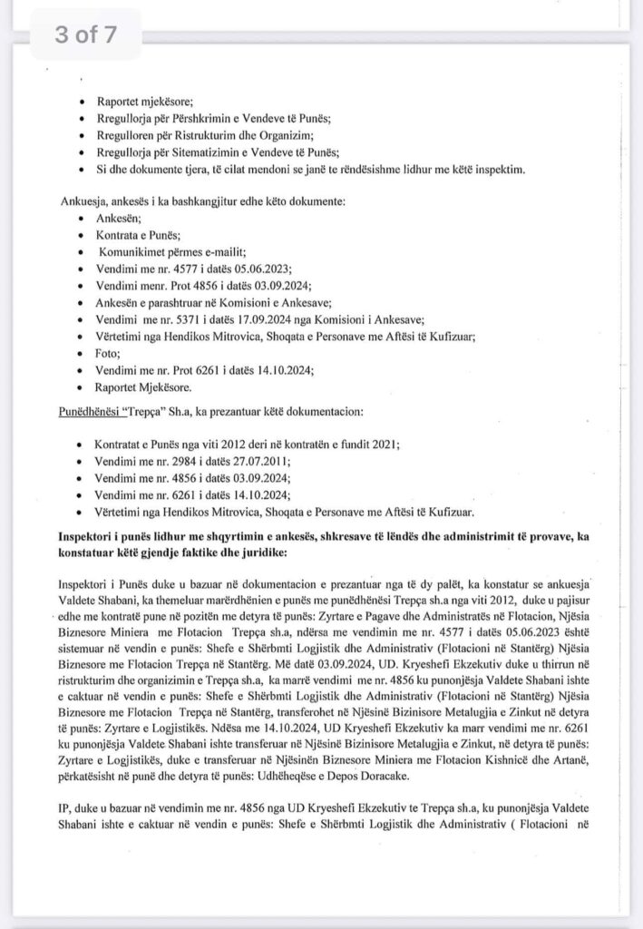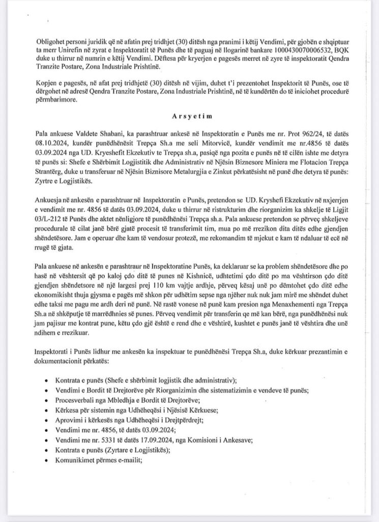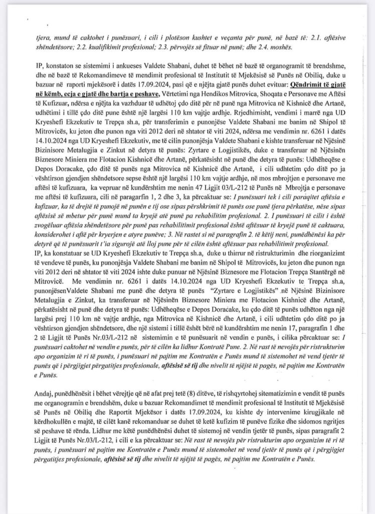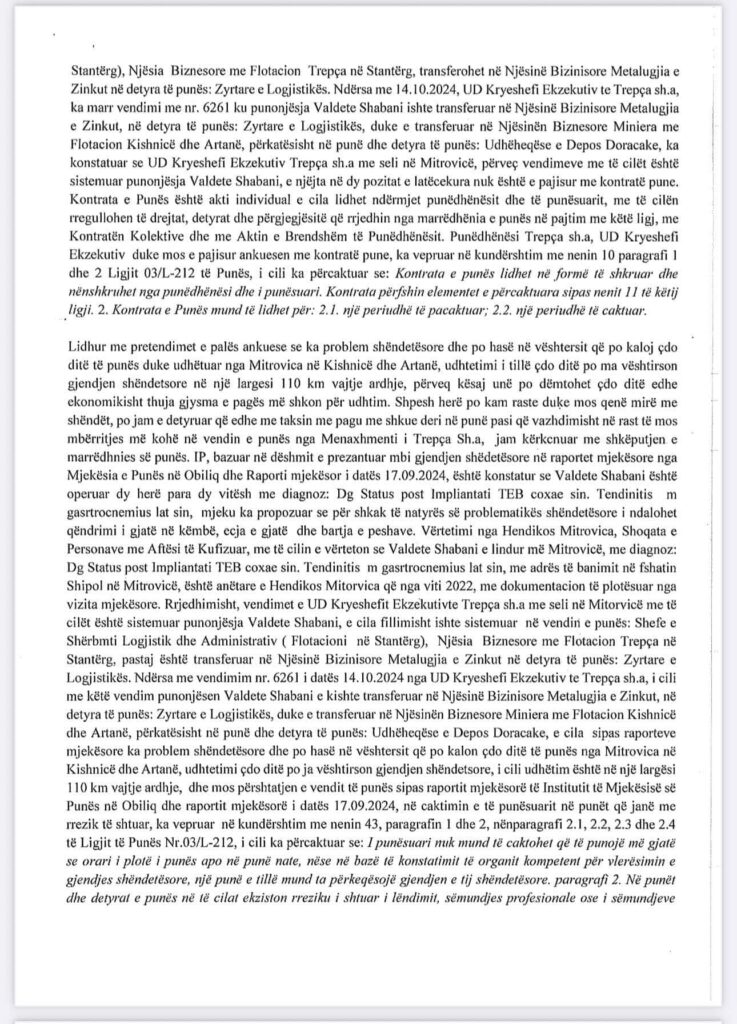 Valdete Shabani, zyrtare në shërbimin logjistik në shërbimin financiar në Tunelin e Parë në Minierën e Trepçës në Mitrovicë, për një kohë të gjatë ka qenë viktimë e një trajtimi të padrejtë nga ana e menaxhmentit të kësaj ndërmarrjeje. Në mënyrë të padrejtë dhe pa asnjë bazë ligjore, ajo ishte larguar nga pozita e saj pranë vendbanimit dhe ishte transferuar në një depo në Kishnicë, rreth 55 kilometra larg shtëpisë së saj – një zhvendosje që jo vetëm e rëndonte emocionalisht dhe ekonomikisht, por edhe përbënte një padrejtësi flagrante në vendin e punës.