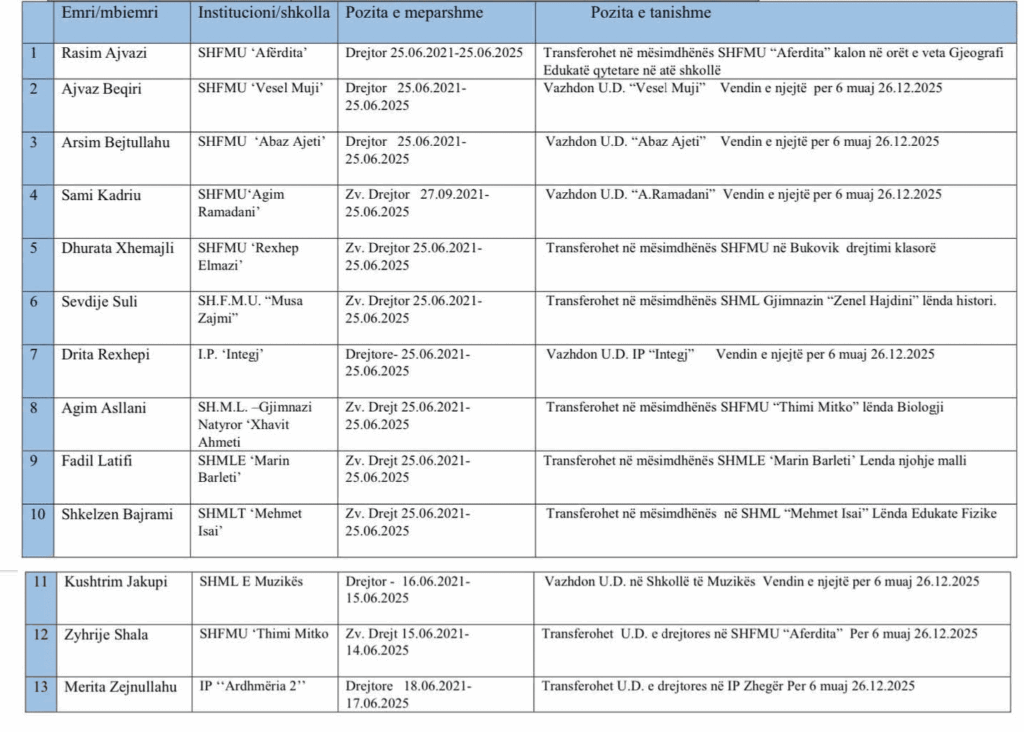 Ndërkohë, Drejtoria Komunale e Arsimit në Gjilan ka publikuar listën e të shkarkuarve, por nuk ka dhënë detaje rreth arsyetimit apo procesit që ka çuar në këto ndryshime të mëdha në menaxhimin e shkollave.