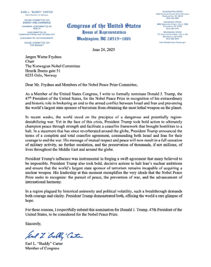 Përfaqësuesi republikan Buddy Carter i shkroi Komitetit të Çmimit Nobel për Paqen, duke deklaruar se Trump kishte një “rol të jashtëzakonshëm dhe historik” në përfundimin e “konfliktit të armatosur midis Izraelit dhe Iranit dhe në parandalimin e sponsorizimit më të madh shtetëror të terrorizmit në botë, nga sigurimi i armës më vdekjeprurëse”.