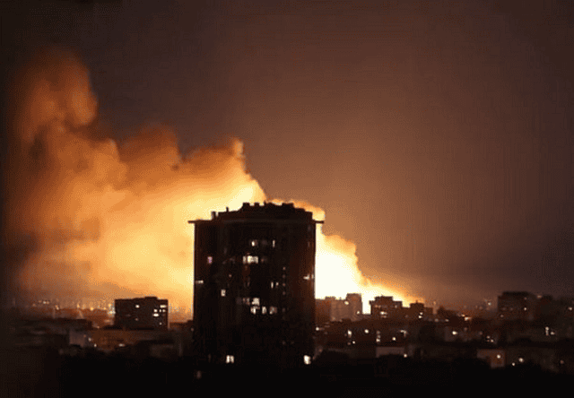 Pak më pas, u dëgjua një shpërthim i fuqishëm dhe kolona tymi u ngritën në pjesë të ndryshme të qendrës së qytetit. Dronët u dëgjuan duke fluturuar mbi zonë.