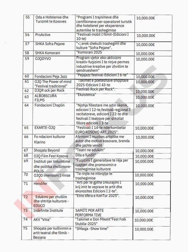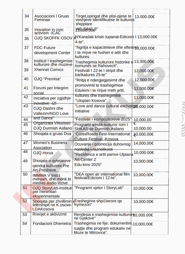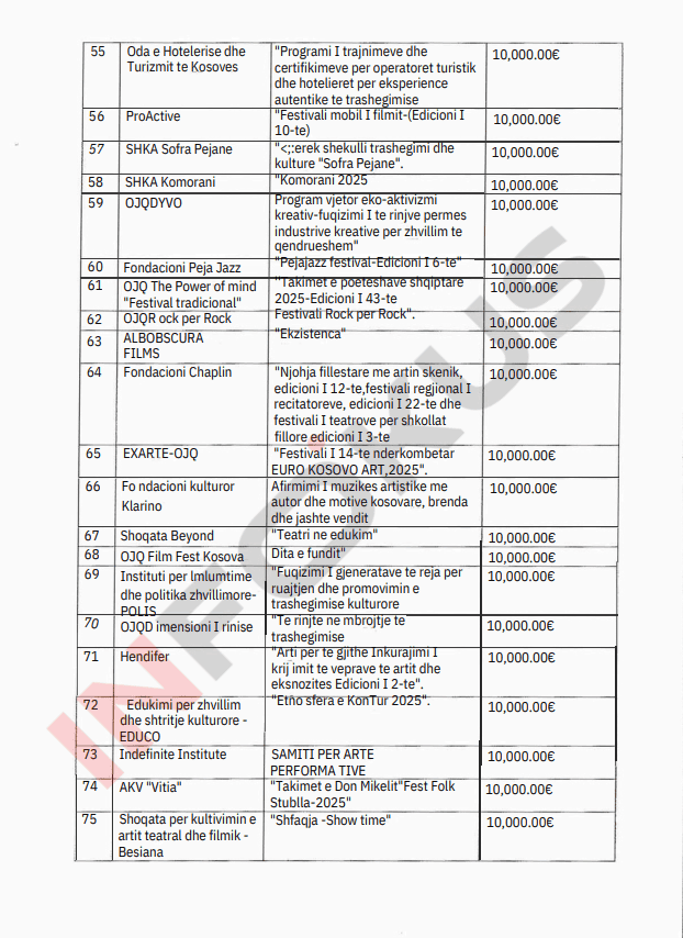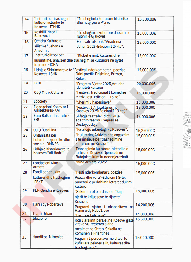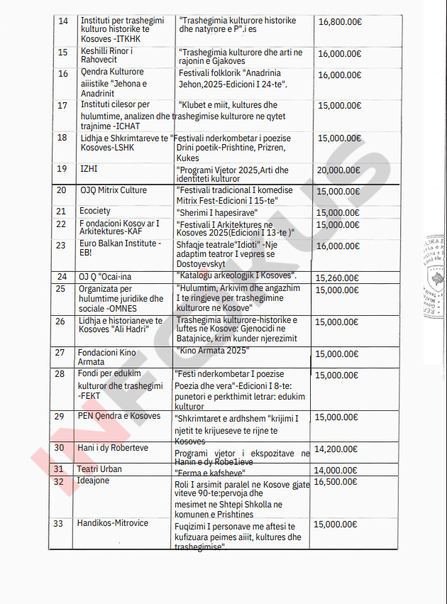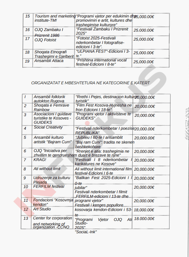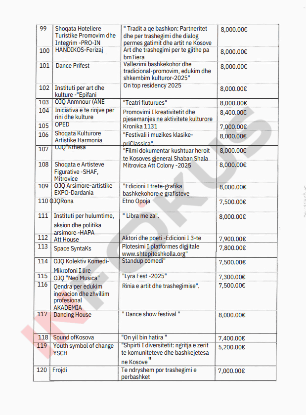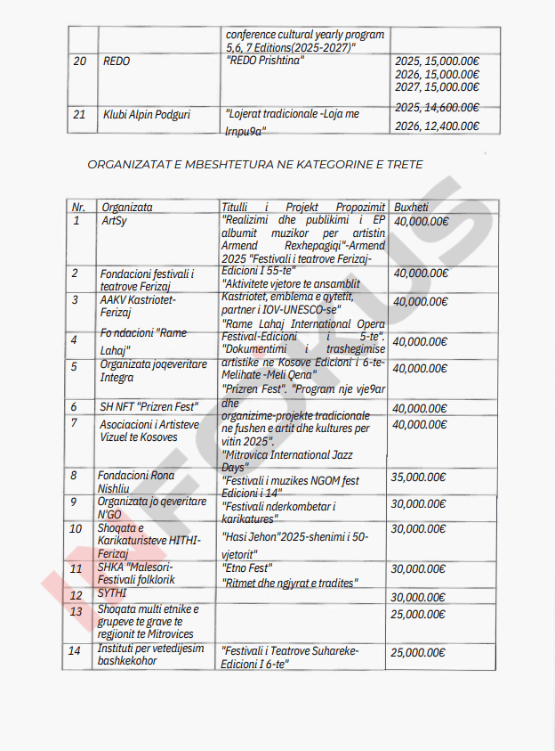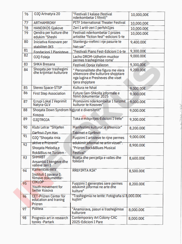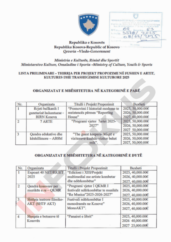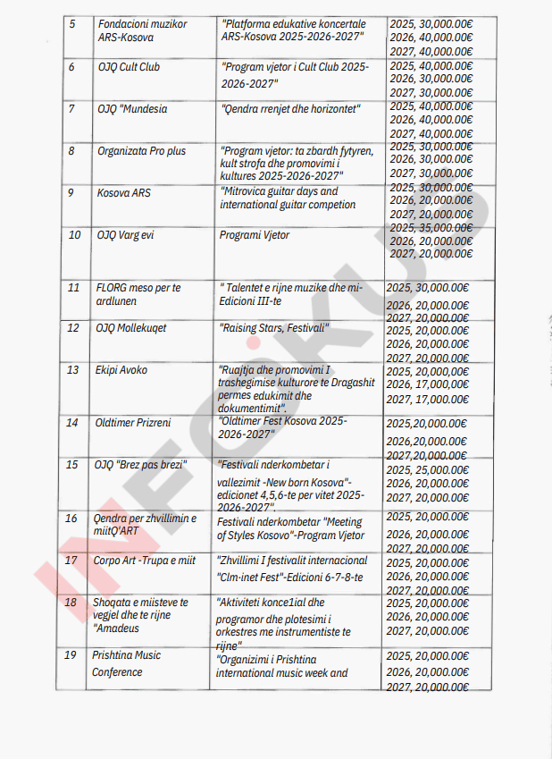 Sipas dokumenteve të siguruara nga Gazeta Infokus, fondet – në vlerë prej 4 milionë e 734 mijë euro – janë ndarë nga Ministria e Kulturës, Rinisë dhe Sportit (MKRS), e udhëhequr nga ministri në detyrë Hajrulla Çeku. Fondet janë paraparë të shpërndahen për projekte që do të realizohen në periudhën 2025–2027.