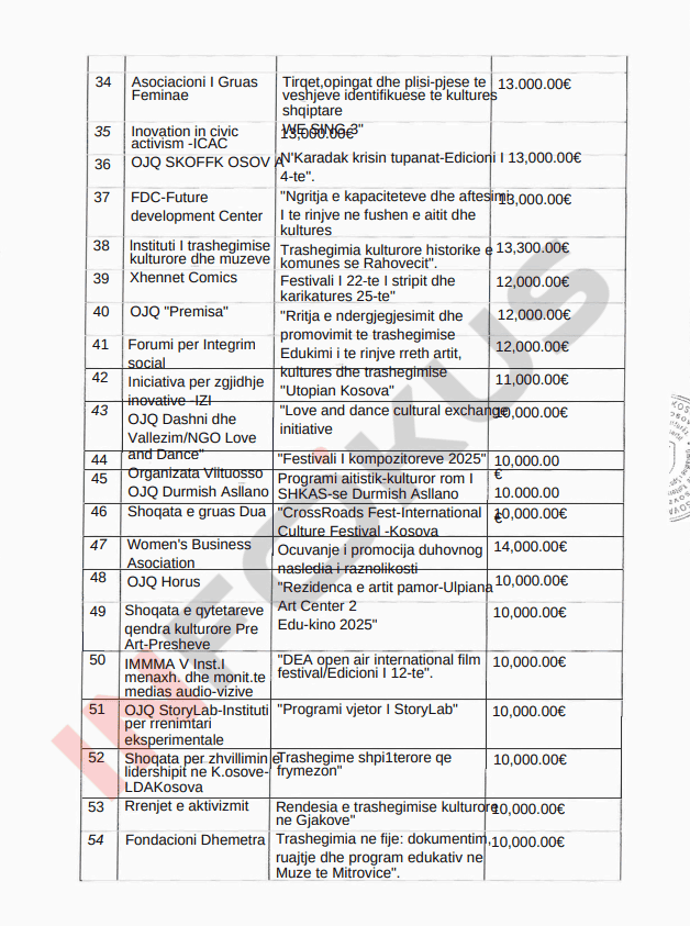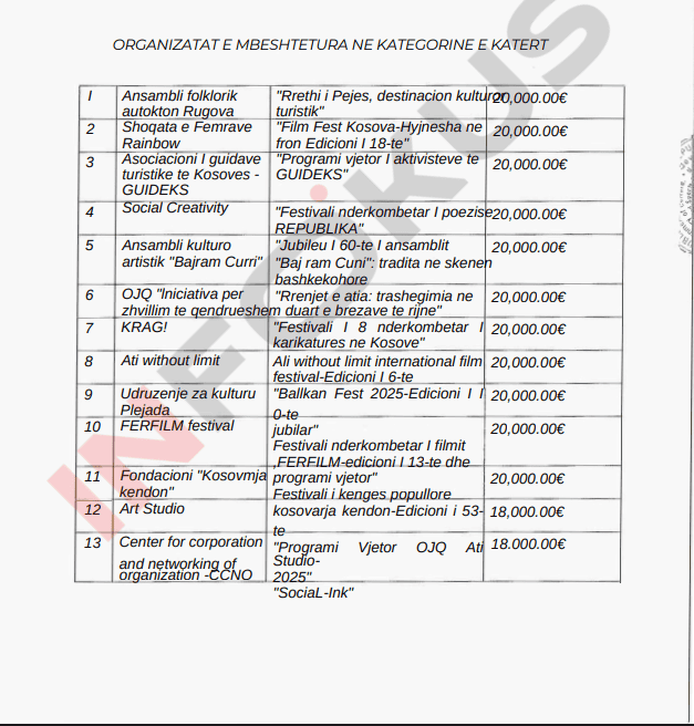 Sipas dokumenteve të siguruara nga Gazeta Infokus, fondet – në vlerë prej 4 milionë e 734 mijë euro – janë ndarë nga Ministria e Kulturës, Rinisë dhe Sportit (MKRS), e udhëhequr nga ministri në detyrë Hajrulla Çeku. Fondet janë paraparë të shpërndahen për projekte që do të realizohen në periudhën 2025–2027.