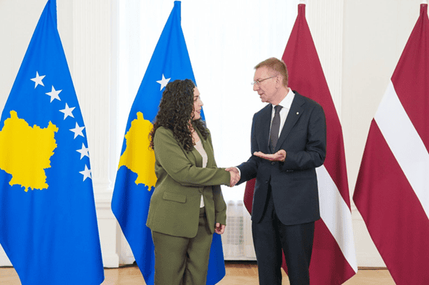 Riga, 15 Korrik 2025 – Presidentja e Republikës së Kosovës, Vjosa Osmani, është pritur sot në një takim zyrtar nga Presidenti i Republikës së Letonisë, Edgars Rinkēvičs, në kryeqytetin letonez, Riga. Kjo vizitë është cilësuar si historike nga Presidenti Rinkēvičs, pasi përbën vizitën e parë të një Presidenti të Kosovës në këtë shtet baltik.