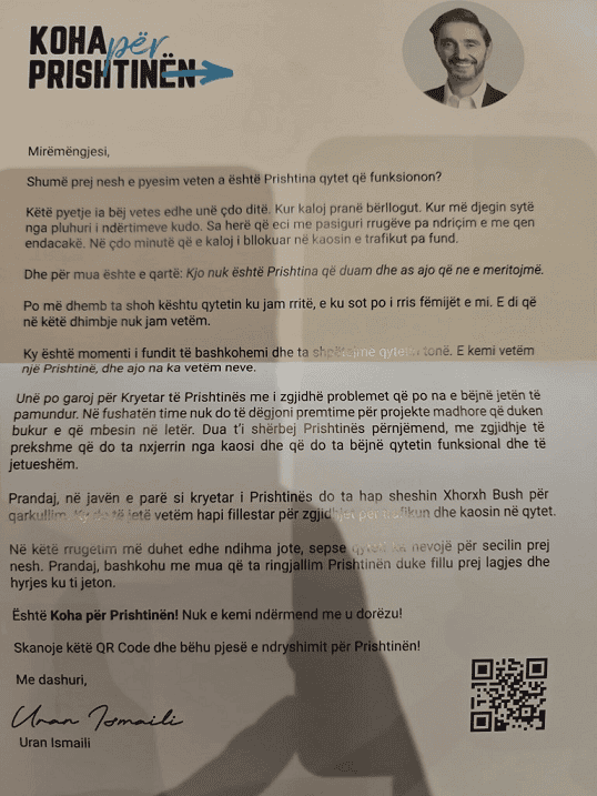 Uran Ismaili ka zgjedhur një mënyrë kreative për të nisur fushatën e tij për të parin e Prishtinës. Ai ka shpërndarë disa letra në gjithë qytetin.