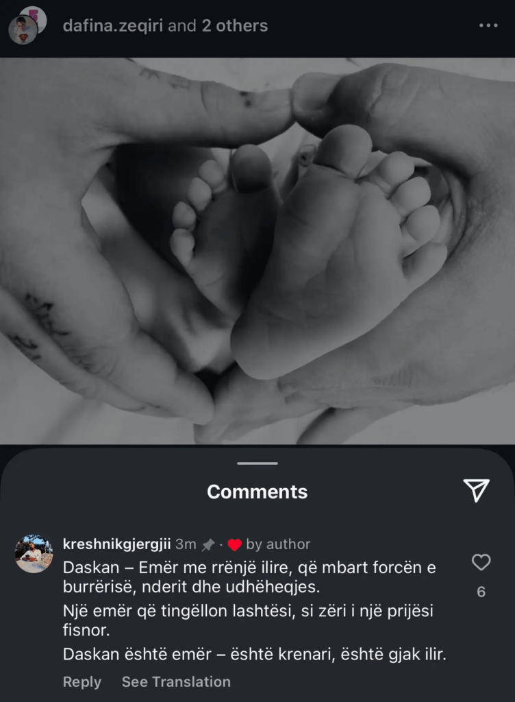 Pas publikimit të fotos së parë të këmbëve të vogla të foshnjës, ndjekësit e Dafinës Zeqiri dhe partnerit të saj janë kuriozë për emrin e veçantë që çifti i ka vendosur djalit të tyre: Daskan.