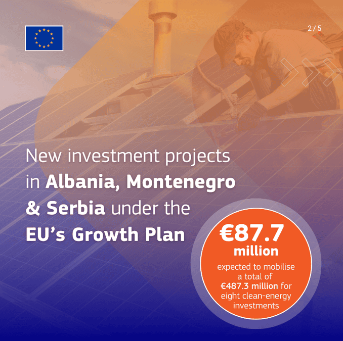 Bruksel – Bashkimi Evropian ka miratuar sot një paketë investimi prej 87.7 milionë eurosh në kuadër të Planit të Rritjes për Ballkanin Perëndimor, duke përfshirë Shqipërinë, Malin e Zi dhe Serbinë në fazën e dytë të financimit për projekte në sektorin e energjisë së pastër. Kjo shumë është aprovuar nga Bordi Operacional i Kornizës për Investime në Ballkanin Perëndimor (WBIF).