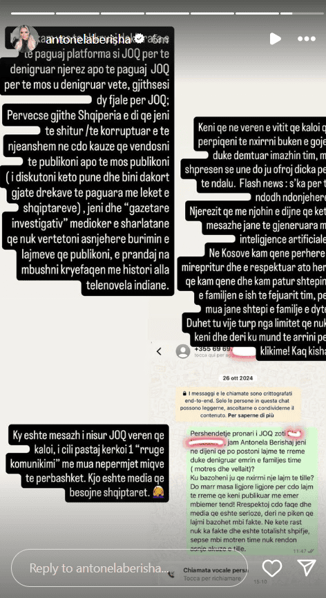 Mirëpo para disa minutash, Antonela ka reaguar në rrjetet e saj sociale duke mos thënë asgjë rreth skandalit, por duke akuzuar faqen JOQ Albania për publikimet e bisedave.