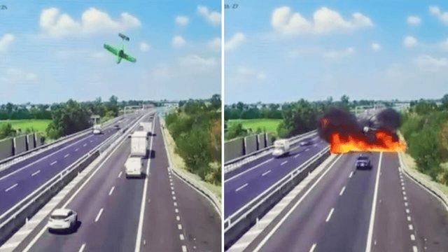Disa makina po qarkullonin në autostradë kur avioni ra sa hap e mbyll sytë duke shpërthyer në flakë.