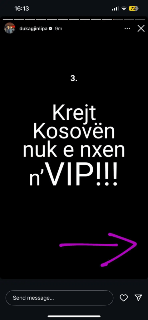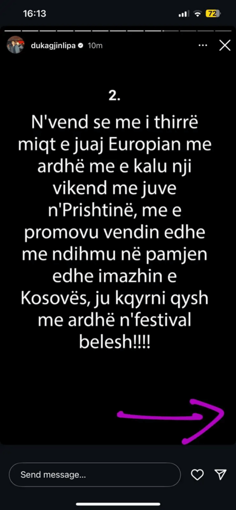 Përmes disa story në Instagram, ai ka kritikuar ashpër personat që, pozicionet e mirëqenies ekonomike dhe shpesh herë jashtë vendit, hyrje “belesh” në një nga ngjarjet e muzikës më të rëndësishme të vitit në Kosovë.