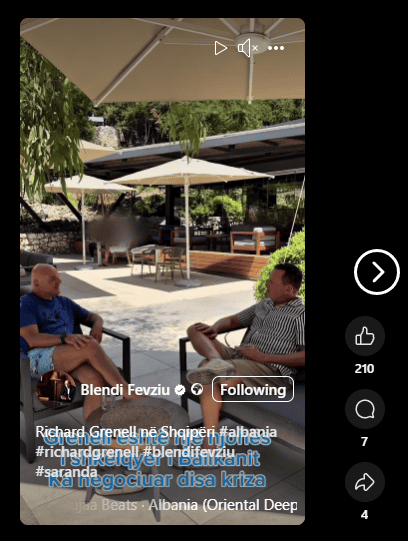 Lajmi është bërë i ditur nga gazetari Blendi Fevziu, i cili ka ndarë pamje nga vizita e Grenellit në rrjetin social Facebook. Sipas postimit të Fevziut, Grenell duket se po e shijon atmosferën bregdetare të Sarandës.