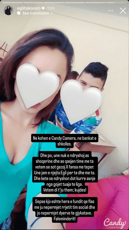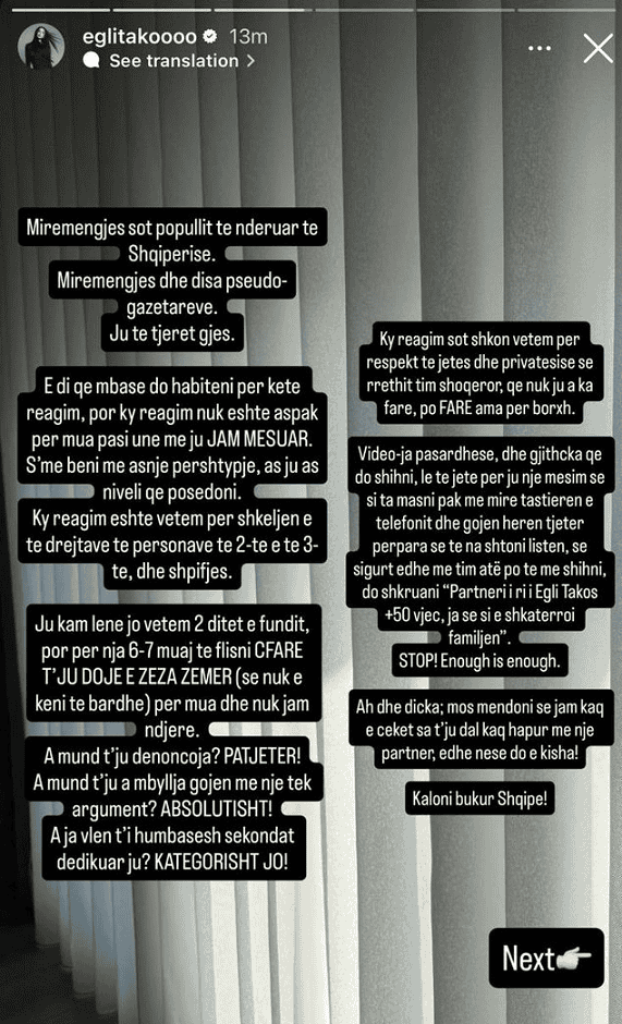 Përmes disa postimeve në Instastory, Egli reagoi ashpër, duke mohuar thashethemet dhe duke bërë thirrje për respektimin e privatësisë së saj dhe të personave që e rrethojnë.