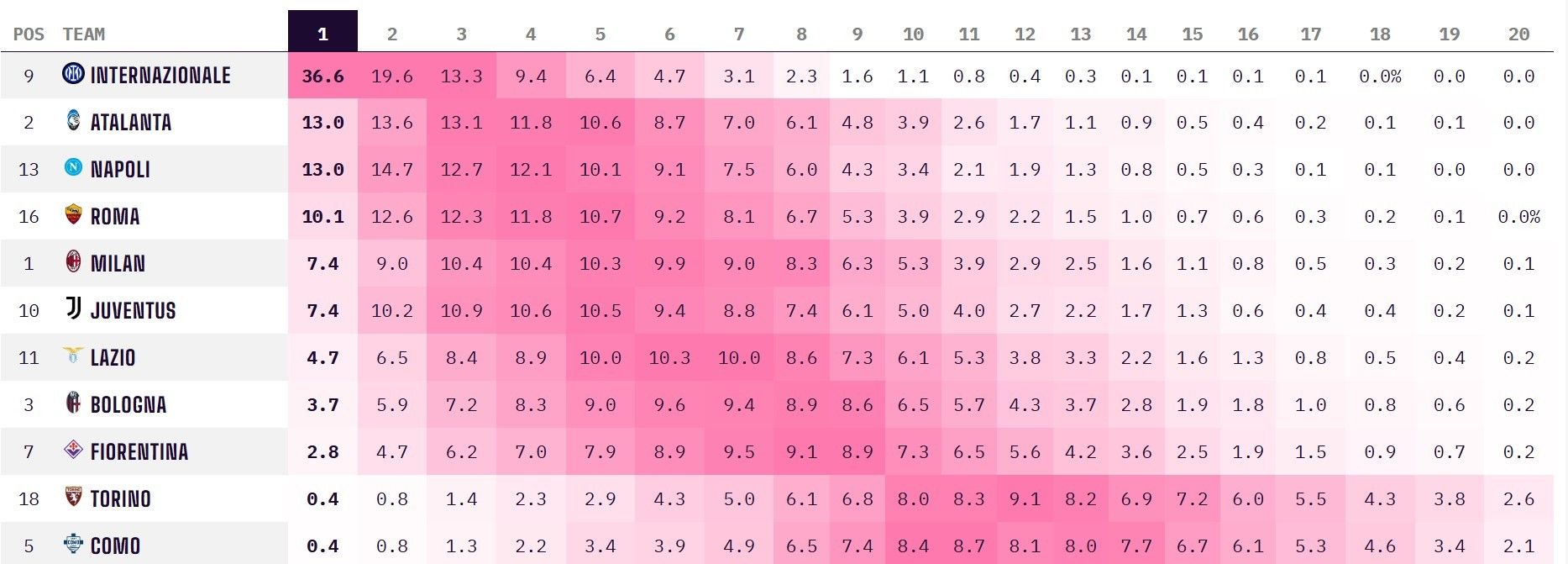 Sipas superkompjuterit të faqes së specializuar të statistikave Opta, Interi cilësohet si favorit absolut për të fituar titullin me 36.59 për qind.