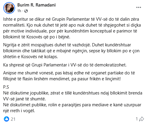 Në postimin e tij, Ramadani shpreh bindjen se këto pakënaqësi të para brenda Grupit Parlamentar mund të shërbejnë si pikënisje për një proces demokratizimi të brendshëm në VV. Megjithëse sipas tij ky proces po vjen me vonesë, pritet që me kalimin e kohës edhe në organet partiake të ketë më shumë hapësirë për mendime të lira, pa frikën e linçimit.