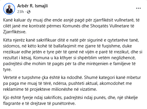 “Këta njerëz kanë sakrifikuar ditë e natë për sigurinë e qytetarëve, duke rrezikuar edhe jetën e tyre. Si shpërblim, Komuna u ka kthyer vetëm mohim të pagës dhe mirëqenies për familjet e tyre”, ka deklaruar Ismajli.