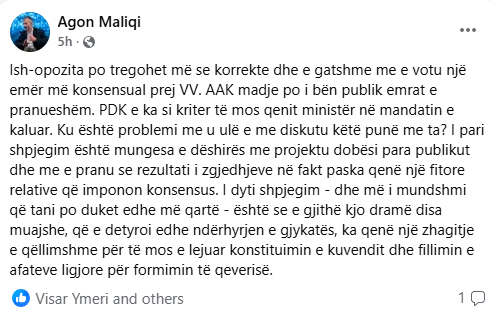 “Ish-opozita po tregohet më shumë se korrekte dhe e gatshme të votojë për një emër më të pranueshëm nga Vetëvendosja. AAK madje ka bërë publike disa emra të pranueshëm, ndërsa PDK ka vendosur kriterin që kandidati të mos ketë qenë ministër në mandatin e kaluar”, ka shkruar Maliqi.