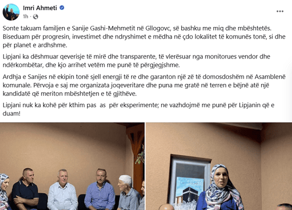 Kryetari i Komunës së Lipjanit, Imri Ahmeti, ka njoftuar se sonte ka takuar familjen e Sanije Gashi-Mehmetit në Gllogovc, së bashku me miq dhe mbështetës.