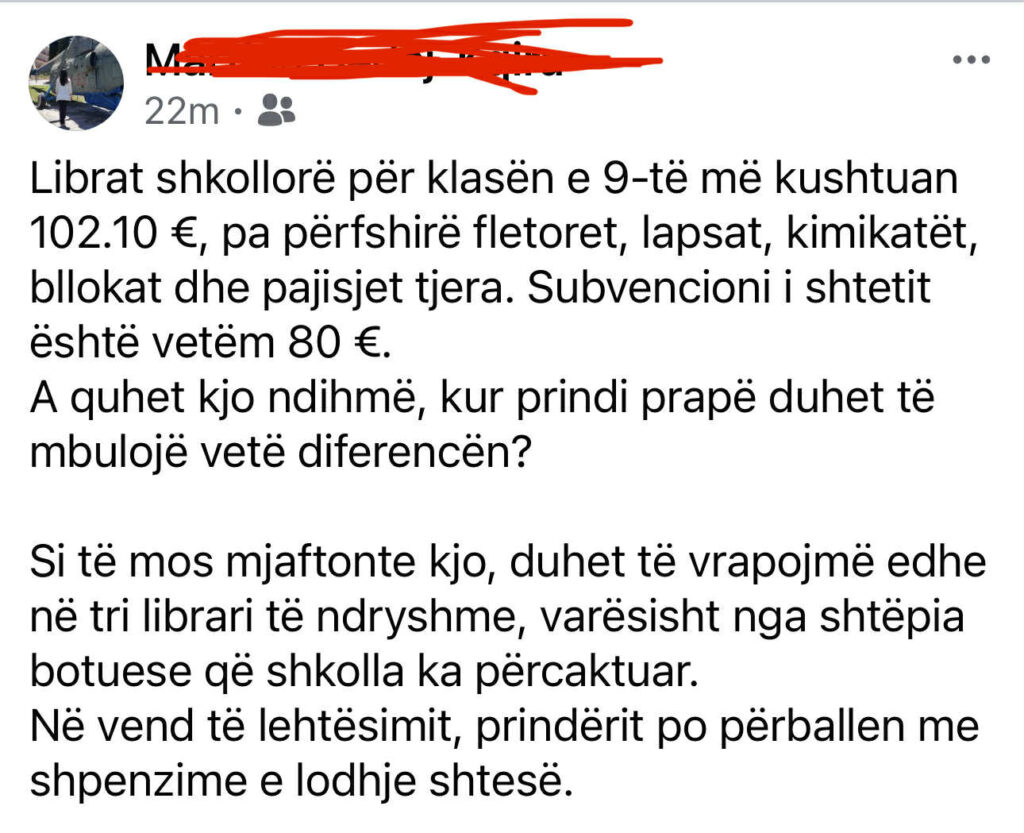 Ata thonë se vetëm librat e klasës së 9-të kushtojnë 102.10 euro, pa përfshirë fletoret, lapsat, kimikat, bllokat dhe pajisjet e tjera të nevojshme për vitin e ri shkollor.