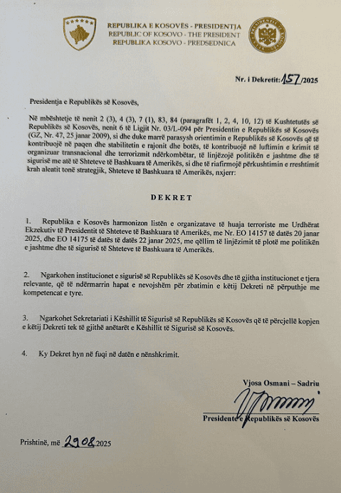“Republika e Kosovës harmonizon listën e organizatave të huaja terroriste me Urdhrat Ekzekutiv të Presidentit të Shteteve të Bashkuara të Amerikës, me Nr. EO 14157 të datës 20 janar 2025, dhe EO 14175 të datës të datës 22 janar 2025, me qëllim të linjëzimit të plotë me politikën e jashtme dhe të sigurisë të Shteteve të Bashkuara të Amerikës”.