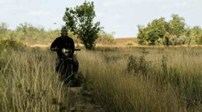 Një motoçikletë kalon me shpejtësi pranë një fushe me luledielli që çelin dhe përplaset me një tjetër, duke lënë pas një re pluhuri.