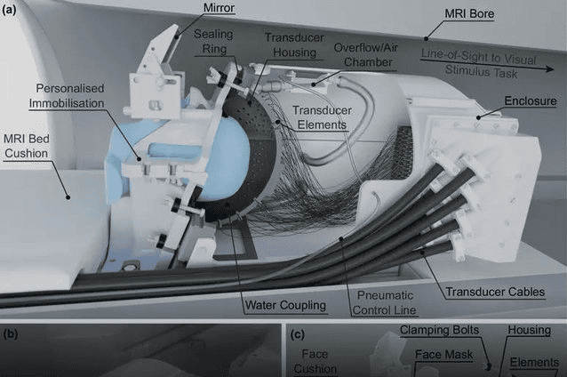 Kasketa me ultratinguj, një helmetë me 256 burime që futet në një skaner MRI, dërgon impulse mekanike në tru: një sistem revolucionar i aftë të synojë rajone të trurit 30 herë më të vogla se pajisjet e mëparshme me ultratinguj të thellë të trurit.