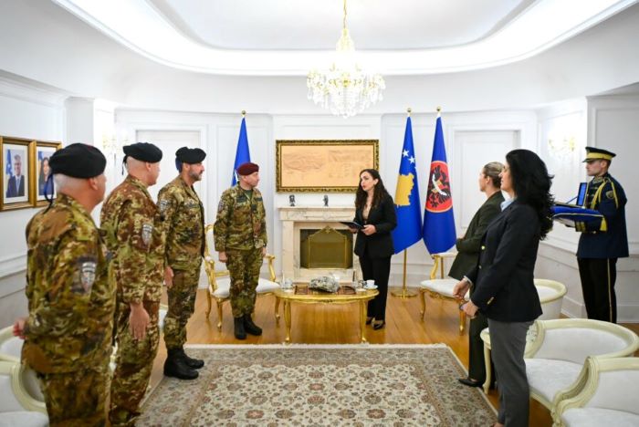 Në përfundim të mandatit të komandantit italian të KFOR-it, Enrico Barduani, presidentja Vjosa Osmani e ka dekoruar atë me Medaljen Presidenciale Ushtarake.