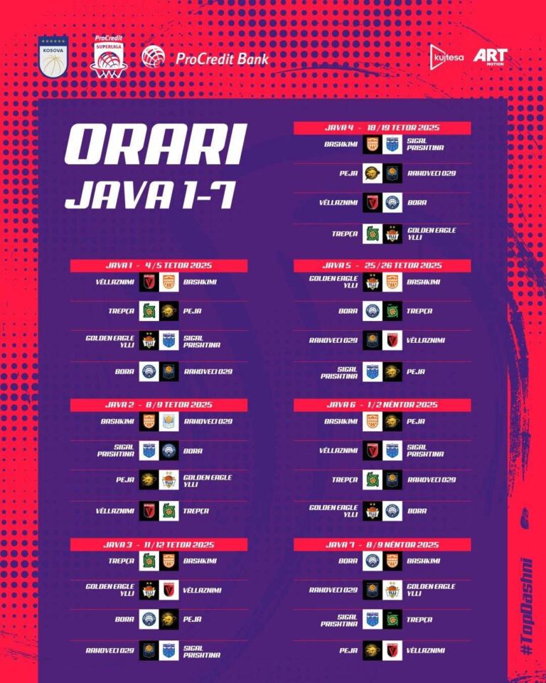 Federata e Basketbollit të Kosovës ka publikuar sot orarin e 7 xhirove të para të edicionit të ri në Superligën e Kosovës në basketboll.