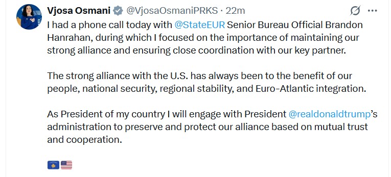 “Sot pata një bisedë telefonike me zyrtarin e lartë të Byrosë së @StateEUR, Brandon Hanrahan, gjatë së cilës u fokusova në rëndësinë e ruajtjes së aleancës sonë të fortë dhe sigurimin e koordinimit të ngushtë me partnerin tonë kryesor”, shkroi Osmani në një postim në X.