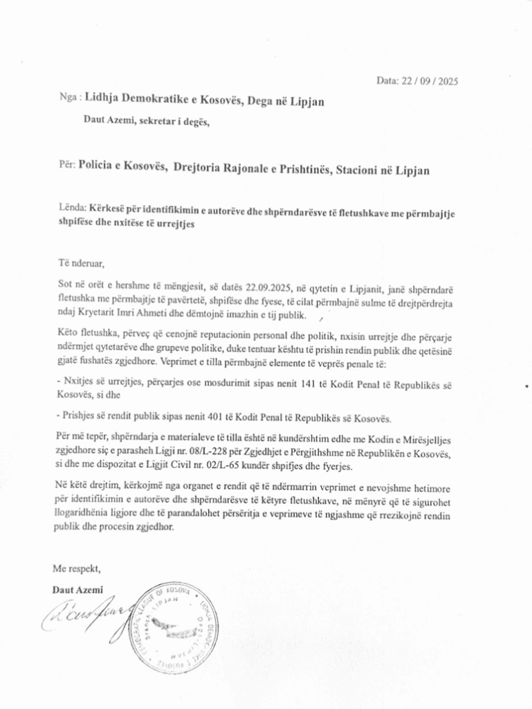 Zyra Ligjore e Degës së Lidhjes Demokratike të Kosovës në Lipjan ka paraqitur sot denoncimin zyrtar në organet kompetente, me kërkesë për identifikimin e autorëve dhe shpërndarësve të fletushkave anonime, të cilat përmbajnë gjuhë të urrejtjes, shpifje dhe denigrim ndaj personalitetit të Kryetarit të Komunës, z. Imri Ahmeti.