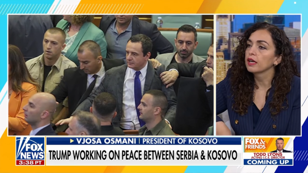 Derisa tema e bisedës mes Osmanit dhe nikoqirit të Fox News s’kishte të bënte me politikën e brendshme të Kosovës, por me tensionet me Serbinë, në sfond u shfaqën pamje nga rrahja e para dy viteve në Kuvendin e Kosovës.