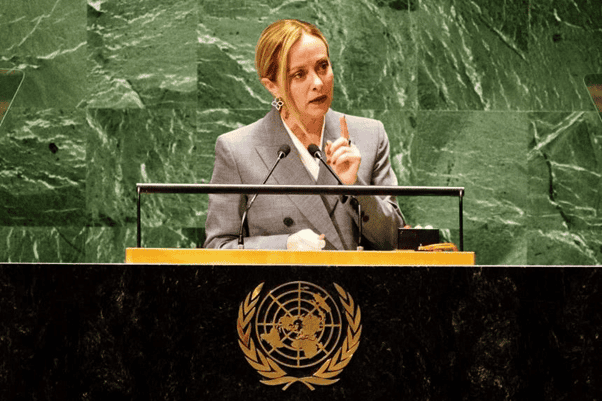 Në një fjalim të drejtpërdrejtë dhe të ngarkuar me mesazhe politike, kryeministrja italiane Giorgia Meloni u shfaq në Asamblenë e Përgjithshme të Kombeve të Bashkuara në Nju Jork me një qëndrim të qartë ndaj dy prej krizave më të mprehta globale: agresionin rus në Ukrainë dhe konfliktin në Lindjen e Mesme.