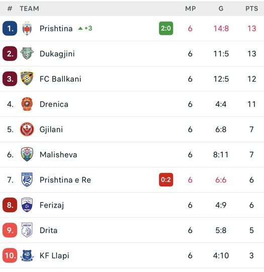 Prishtina shënoi fitore 2:0 ndaj Prishtinës së Re dhe e mori sërish primatin në tabelë me 13 pikë, aq sa ka edhe Dukagjini në vendin e dytë.