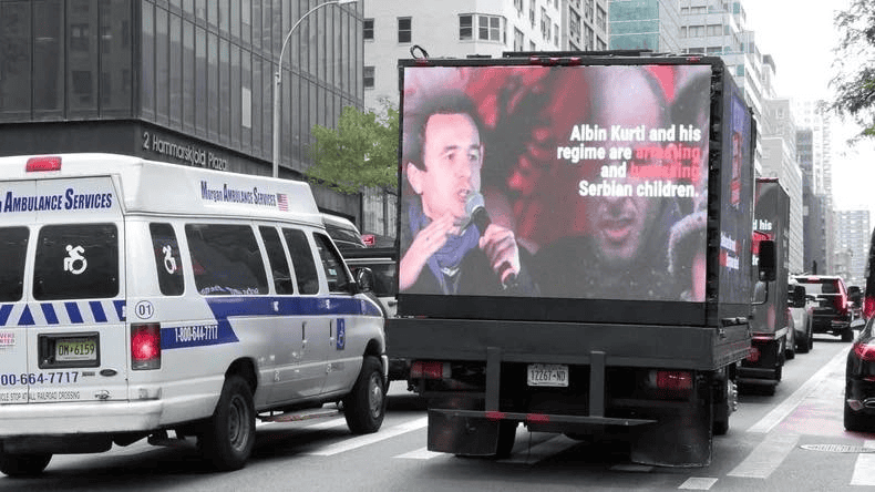 Në rrugët e qytetit janë vërejtur kamioneta të mbuluara me postera të mëdhenj, ku shfaqet fotografia e Kurtit e shoqëruar me akuza të rënda. Mesazhet e shkruara në anglisht përfshijnë: