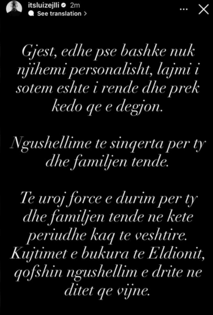 “Gjest, edhe pse bashkë nuk njihemi personalisht, lajmi i sotëm është i rëndë dhe prek këdo që e dëgjon. Ngushëllime të sinqerta për ty dhe familjen tënde,”- shkruan Luizi.