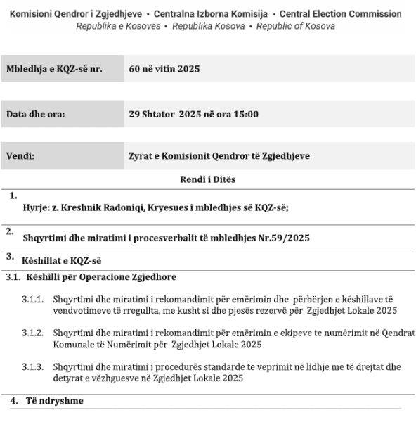 “Ju njoftoj se sot (e hënë, 29.09.2025, ora 15:00) Komisioni Qendror i Zgjedhjeve mban mbledhjen e radhës me rendin e ditës të cilin e gjeni të bashkangjitur.”