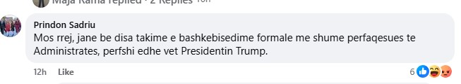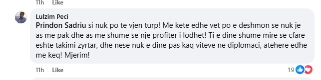 Kjo fjali e ish-diplomatit, Lulzim Peci, i pengoi Zotëriut të Parë, Prindon Sadriut.Sadriu me anë të një komenti në shkrimin e Pecit në ‘Facebook’ i tha “mos rrej” dhe shtoi që janë realizuar disa bashkëbisedime formale me shumë përfaqësues të administratës aktuale në SHBA nga establishmenti kosovar.