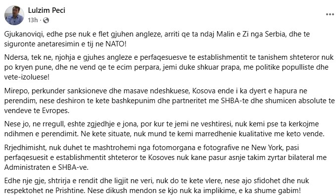 Peci në postimin e tij bëri një krahasim mes liderëve të Malit të Zi dhe Kosovës, ku tha se Milo Gjukanoviq përkundër që nuk ishte njohës i mirë i gjuhës angleze arriti ta anëtarësonte shtetin e tij në NATO. Ndërkaq, shtoi se lidershipi aktual përkundër që janë njohës të mirë të anglishtes “nuk po kryen punë”.