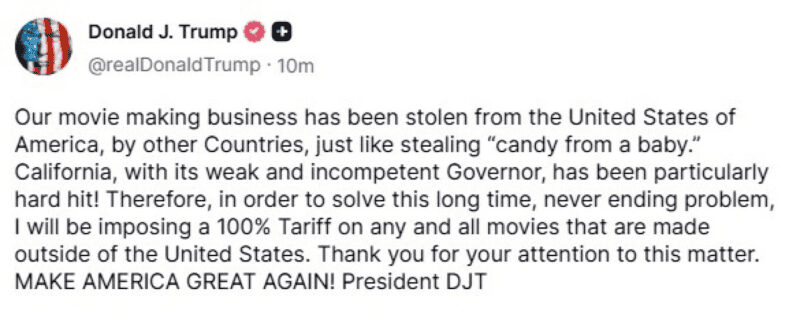 Në një deklaratë të bërë publike, Trump akuzoi vendet e tjera se po “vjedhin” industrinë e filmit amerikan, duke e krahasuar këtë fenomen me “marrjen e karameleve nga një foshnjë”.