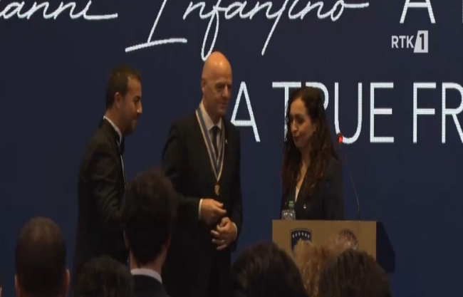 Në një ceremoni zyrtare në njërin nga hotelet në periferi të kryeqytetit, presidentja e Kosovës, Vjosa Osmani, të mërkurën, ka dekoruar kreun e FIFA-s, Gianni Infantinon.