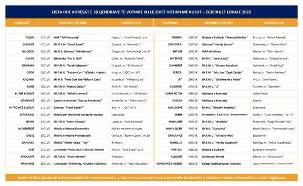 Komisioni Qendror i Zgjedhjeve njofton se për të mundësuar votimin me kusht në Zgjedhjet Lokale për Kryetarë të Komunave dhe për Kuvende Komunale, në çdo komunë është caktuar nga një Qendër Votimi.