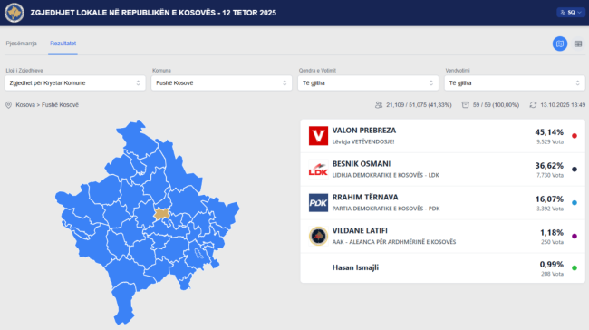 Valon Prebreza i LVV-së ka dalë i pari në Fushë Kosovë dhe sipas rezultateve preliminare, ka marrë 45,14% të votave.