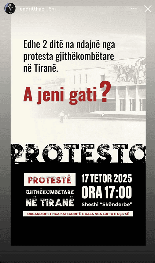 Endrit Thaçi, djali i ish-presidentit të Kosovës, Hashim Thaçi, ka rishpërndarë thirrjen për protestën gjithëkombëtare që do të mbahet të premten në sheshin “Skënderbe” në Tiranë. Në një postim në llogarinë e tij në Instagram, ai ka ndarë thirrjen zyrtare për protestë duke shtuar pyetjen simbolike: “A jeni gati?”