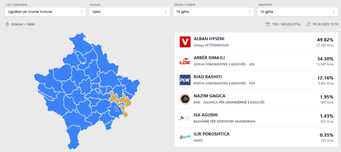 Nga rezultatet e deritshme që jep KQZ, Alban Hyseni ka 49.82% të votave, ndërsa Arbër Ismajli 34.30.