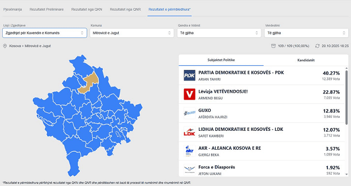 Nga të dhënat e KQZ-së, del se Partia Demokratike e Kosovës mbetet e para me 40,27%, e pasuar me Vetëvendosjen me 7 mijë e 35 vota apo 22,87 për qind.