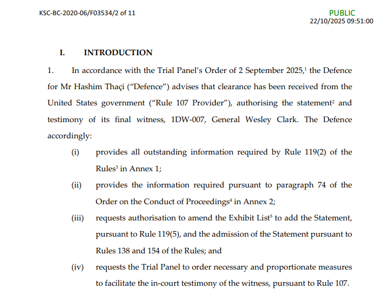 “Në përputhje me Urdhrin e Trupit Gjykues të 2 shtatorit 2025, mbrojtja e z. Hashim Thaçi njofton se është marrë miratimi nga qeveria e Shteteve të Bashkuara (“Ofruesi i Rregullit 107”), që autorizon deklaratën2 dhe dëshminë e dëshmitarit të saj të fundit, 1DË-007, Gjeneral Wesley Clark”, thuhet në njoftimin e gjykatës.
