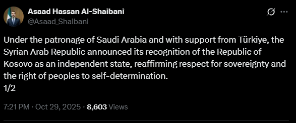 Ministri i Jashtëm i Sirisë, Asaad Hassan Al-Shaibani, ka shkruar në “X” për njohjen e Kosovës nga Siria.