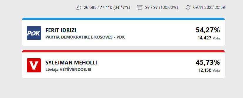 Ferit Idrizi në Vushtrri ka fituar 54,27% të votave