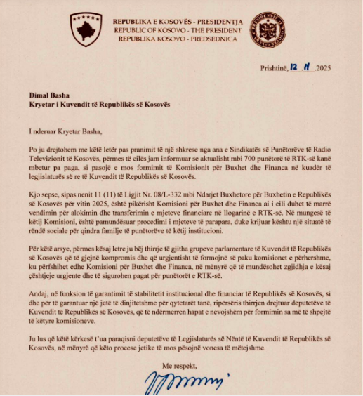 Për shkak të krizës së pagave që ka përfshirë transmetuesin publik, presidentja e Kosovës, Vjosa Osmani, i ka drejtuar letër kryetarit të Kuvendit, Dimal Basha, për të adresuar mungesën e komisionit për financa, i cili edhe merr vendimin për aprovimin e mjeteve buxhetore për RTK-në.