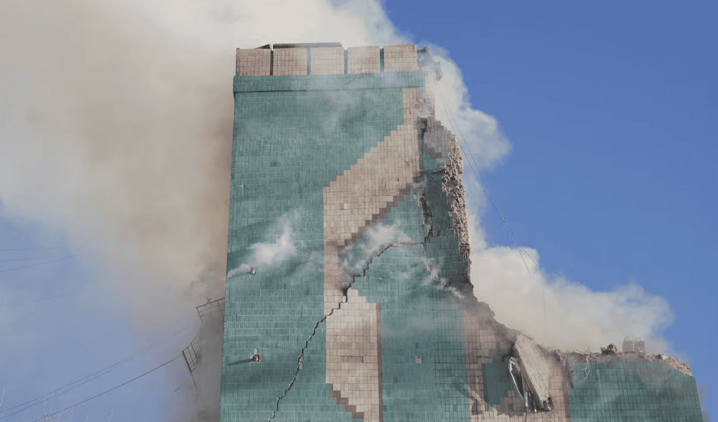 Katet e sipërme të ndërtesës së banimit në Ternopil u shkatërruan nga sulmi. Tymi i zi u përhap lart, ndërsa një shkëlqim portokalli digjej përmes mjegullës nga një zjarr në kullën e lartë.
