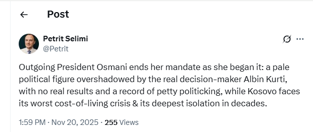 “ Presidentja në largim Osmani e përfundon mandatin e saj ashtu siç e filloi: një figurë e zbehtë politike e lënë në hije nga vendimmarrësi i vërtetë Albin Kurti, pa rezultate reale dhe me një rekord të politikave për interes personal., ndërsa Kosova përballet me krizën më të keqe të kostos së jetesës dhe izolimin e saj më të thellë në dekada”, ka shkruar Selimi.